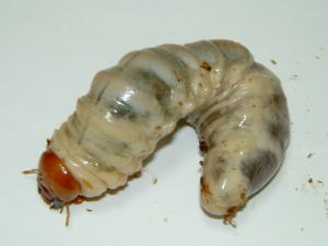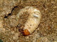 2005年7月29日某産地にて、3♀採集!そのうちの1♀が太く、採集当時「50oはあるのでは?」と思わせる程の太さに感じ(採集時はどの個体も大きく見えるんですよね(+o+)\) その太い♀で、何とかこの産地の極太血統をと思い即産卵セット!! 約1ヵ月後の9月10日に割出した所2本の材のうち1本は空振り(ToT) もう1本も空振り気味!!「なんだぁ!空♀か?」と諦めかけたところ、ポロッと幼虫がo(ToT)o いました!!一頭だけど(^-^)V 初令なれど勝手に♂と決め付け1000cc菌糸瓶へ即投入しました。 途中、食痕から見える幼虫に「何だか♀ぽいなぁ(・o・)」「いや!絶対に♂だ!多分♂だ!♂であってくれ!」だんだん不安になってきた(^o^; |