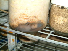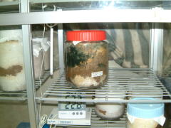 | 1月11日 | 最初の瓶交換から1ヶ月半が経ち、時折瓶側面に幼虫の姿が見えます(^.^) しかし、あまり大きく成長していないようだぞ(・_・;) あまりジロジロ見過ぎなのか!(これじゃあ、他のWF1幼虫の方が成績いいじゃん!)![]() 次回の瓶交換まで後1ヶ月チョット!温室の奥の方へ瓶を移動して、じっくり餌を食べてもらいましょう(汗) |