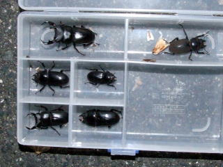8月2日 自棄のヤンパチ(笑)で今日も出動!(実際は5日くらいから状態が良くなるのですが!日中の気温上昇に居ても立っても居られません(^_^;))18:00現地到着し、一番奥のポイントを視察(昨年のピカ一のポイントなのに、やはり今期は採れる気がしません)結局、昨日のポイントで張ることに決めセッティング開始!辺りも暗くなり、19:35点灯です。昨日の様な羽虫の集まりは有りませんが!点灯直後からアカアシの♂・♀がドンドン飛来します。20:00を過ぎた頃には、早くも20頭を超え!『何か久々の本命飛来の予感が〜』  20:30普通種は30頭を超え!数えるのも飽きたので適当に拾っては雑居ケースへ投入です。雑居ケースにはカブト♀も入って居るので、蓋を空ける度に独特のカブト臭が『くっせぇ(汗)』暫らくし、ライトの上空を大き目の♀がホバリングしているではありませんか!『落ちろ〜!!』